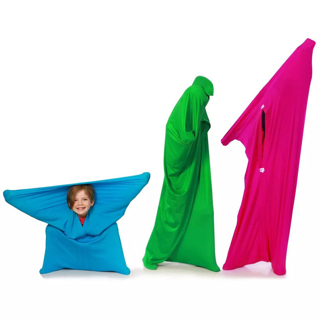 The high quality, translucent yet resistive fabric of our body socks creates an unparalleled sensory experience (check out the video below!). Body socks offer unlimited opportunities to improve proprioception due to the full body deep pressure, while also increasing motor planning skills and balance.  The action of pushing against the resistive fabric benefits those with tactile defensiveness as well as sensory seekers. Sensory Matters' Body Socks are designed to allow the individual to have their head inside or outside, according to personal preference.  The body sock can become a calming, safe haven for a child who is overloaded with sensory input and who needs to self-regulate.  Available in 4 sizes: Small : 100cm Medium : 120cm Large : 140cm Extra Large : 160cm