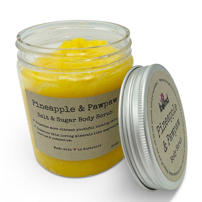 Pineapple & Papaya body scrub Get back to basics - contains all natural goodies your skin will ❤ & none of the nasty stuff that you don't really need. Bomd body scrub 270gm Pack Lather me up all over your body and say "Hello" smooth soft exfoliated hydrated skin... Make "Bomd Body" skin loving Pineapple and Papaya sea salt and sugar body scrub part of your weekly routine. 330gm jar Pineapple and Papaya fragrance Body scrub helps increase blood circulation while gently exfoliating to removing impurities and dead skin cells that build up in our daily lives. Regular use assists in reducing blemishes and acne. Bomd body scrub contains rich salts, oils and natural vitamin E, you will reveal soft fresh glowing skin from the very first use . Make dry skin a thing of the past.. Not tested on Animals Free from harsh chemicals, no parabens. Australian Made. Sea Salt Packed with healthy skin friendly minerals like Magnesium, Calcium & Potassium. Absorbs toxins from the body & skin reducing bacteria relieving acne & encouraging the healing process. Is an excellent exfoliate Helps relax muscles Vitamin E Vitamin E works to block free radicals helping to reduce the signs of premature ageing Coconut Coconut Oil is loaded with antibacterial & anti fungal properties soothing dry skin Sweet Almond Oil Contains vitamin A, great for preventing acne break outs. Helps to gently dislodge debris from deep within skin pores and follicles. How to use your new Body Scrub: Wet your skin thoroughly in the shower or bath Take a handful or two and spread over your whole body massaging in a circular motion, make sure you get those problem areas (if this is your first time it is a bit messy – you’ll become a pro in no time) Leave on your skin for 1-5 minutes, let the salts and oils do their thing Rinse all the scrubby bits off & you’ll be left with smooth moisturised glowing skin Make bomd body scrub part of your routine 2-3 times a week – you’ll soon see the benefits Made with ❤️ on the East Coast of Australia Ingredients:Sodium Chloride (Sea Salt), Sucrose, Cocos Nucifera (Coconut) Double - Cocos Nucifera (Coconut) Oils, Amygdalus Dulcis (sweet almond oil), Sodium Lauryl Sulfoacetate (coconut based) Gycerin PF Vegetable, Vitamin E (d-alpha-tocopherol), Phenoxyethanol and ethylhexylglycerin, Arrowroot, Fragrance Oils and or Essential Oils.