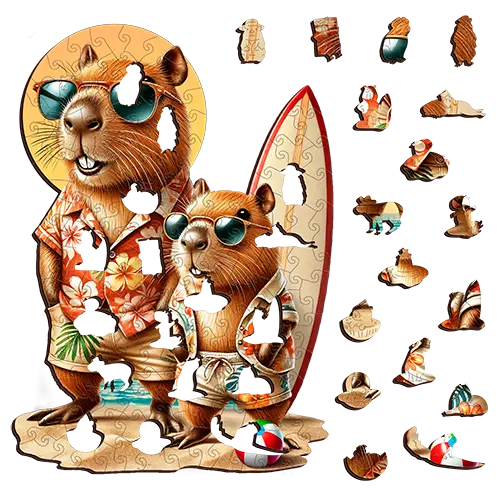 "Chillin’ in Style: Capybara Beach Legends 🕶️🌴" "Meet the coolest duo on the block—these capybaras know how to rock beach vibes! Decked out in tropical shirts and shades, they bring effortless charm and summer fun to your puzzle adventure. Plus, hidden among the uniquely shaped pieces, you'll discover surprises that make this design even more delightful. Get ready for a puzzle experience that’s as laid-back and stylish as these sun-loving capys!"