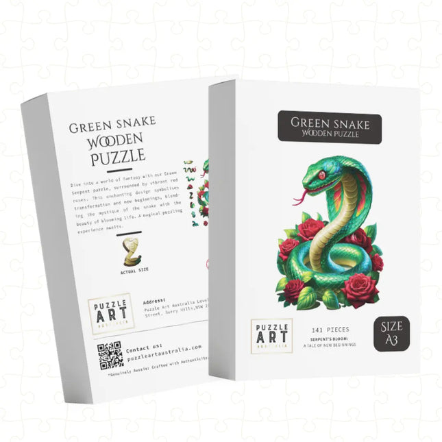 "Serpent’s Bloom: A Tale of New Beginnings 🌹🐍" Dive into a world of fantasy with our Green Serpent puzzle, surrounded by vibrant red roses. This enchanting design symbolizes transformation and new beginnings, blending the mystique of the snake with the beauty of blooming life. A magical puzzling experience awaits! Number of pieces A3 - 141 and A5 - 75