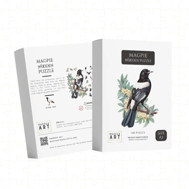 "MAJESTIC MAGPIE PUZZLE: DEFEND YOUR TERRITORY!" "Experience the protective spirit of the Australian bush with our Magpie puzzle. Piece by piece, immerse yourself in the fierce beauty of this iconic bird, guarding its territory with unwavering determination. Large (A3) Most Popular 📏 Approx 39.3 × 29.6 cm (19.6 x 14.7 inches) 🧩 150 pieces ⏱ Assembly time: 4-6 hours Small (A5) Perfect for Beginners 📏 Approx 15.4 × 11.6 cm (7.7 x 5.8 inches) 🧩 70 pieces ⏱ Assembly time: 2-3 hours