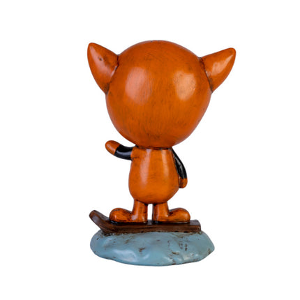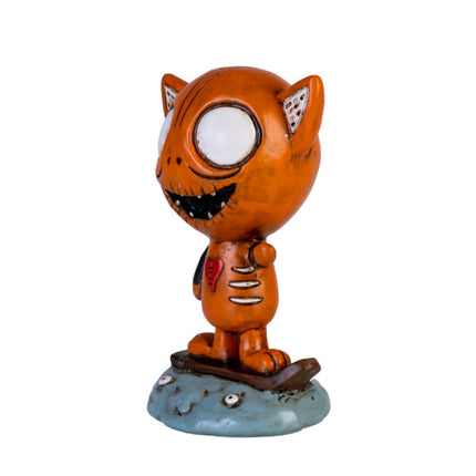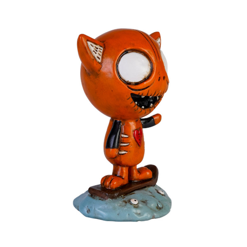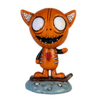 Gus Fink is known for his unique cute and creepy art. He believes everyone should embrace their weird and dark side. His art combines this with childlike charm, infusing it with light! Rough around the edges and downright adorable, this Skygor figurine is orange with fox ears, big white eyes, exposed ribs, and a red fixed-up broken heart on his belly. He's riding a wooden skateboard on a living rock! Proudly display this sweet and scrappy figurine!