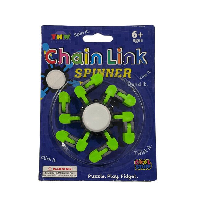 This item right here is an amalgamation of 2 of our best selling fidget toys ever, the Fidget Spinnerand the Fidget Chain Gadget Puzzle.It has all the awesome qualities of the Fidget Spinner: spin it on the tip of your finger and see how long you can balance it,spin them at your desk and see how many you can stack and spin at the same time.And all the wonderful features of the Fidget Chain Gadget Puzzle: manipulate the arms into thousands of shapes and unique configurations and listento the satisfying clicking noises it makes when doing so.Twist, click and shape the arms and then spin!Enjoy it in a number of ways!4 colours to choose fromRecommended Ages 3 years +WARNING: Choking Hazard. Small PartsNot suitable for children under 3 years