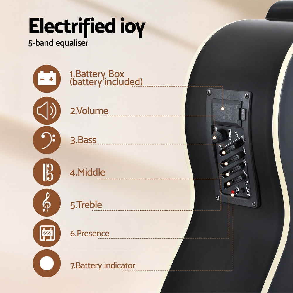 Unleash deep, rich tones with the Alpha 43-inch acoustic bass guitar. This full-size dreadnought type bass guitar features a powerful 4-band equalizer, allowing you to fine-tune your sound. With durable steel strings and a sleek black glossy finish, this Alpha guitar is built for impressive performance. It boasts a basswood body and catalpa wood neck, offering both quality craftsmanship and comfortable playability.