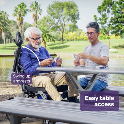 Getting on and off this Equipmed Power Wheelchair is easy thanks to swing-up armrests and the swing-up footrest. The retracting armrests also give you the option of dining at a table.