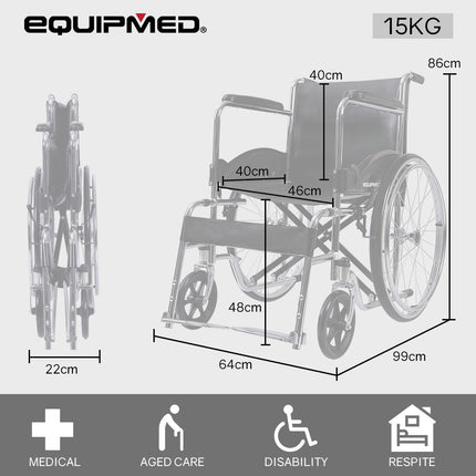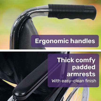 This Equipmed wheelchair features height adjustable footrests that also swing up for easy access onto the wheel chair. Comfy padded armrests and a comfortable seat with a generously proportioned backrest ensure a comfortable ride. And, thanks to the 2 second folding action and ergonomic handles, it makes for a relaxing day out for any helpers, too!