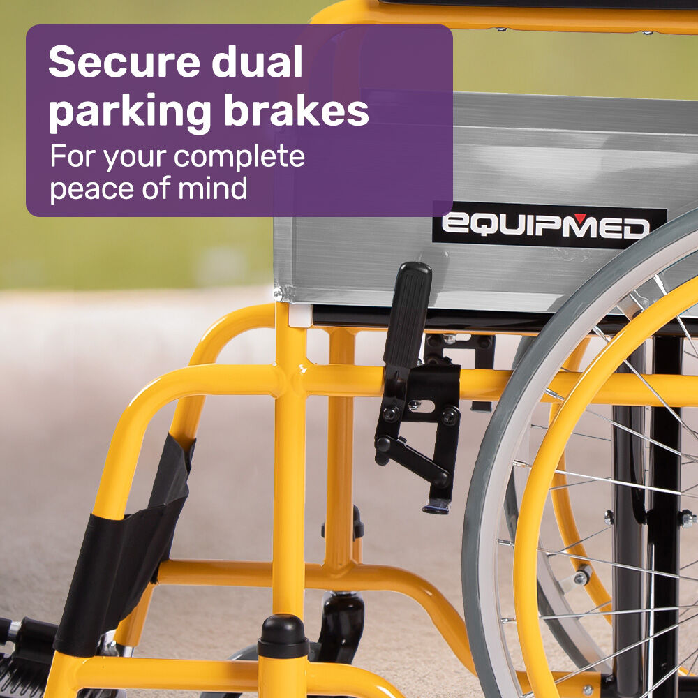 Equipped with an adjustable seatbelt for secure positioning, this wheelchair also features dual-wheel brakes for added stability. The 22-inch airless rear tyres provide a smooth, steady ride, while the 360-degree swivelling front castors allow easy navigation through tight spaces, ensuring effortless control in any environment.