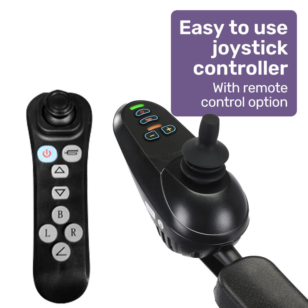 Steering is intuitive using the joystick that can be mounted on either the left or right-hand side and with easy-to-read LED controls. You can travel along at a sensible speed of up to 7km/h, which is a brisk walking pace.