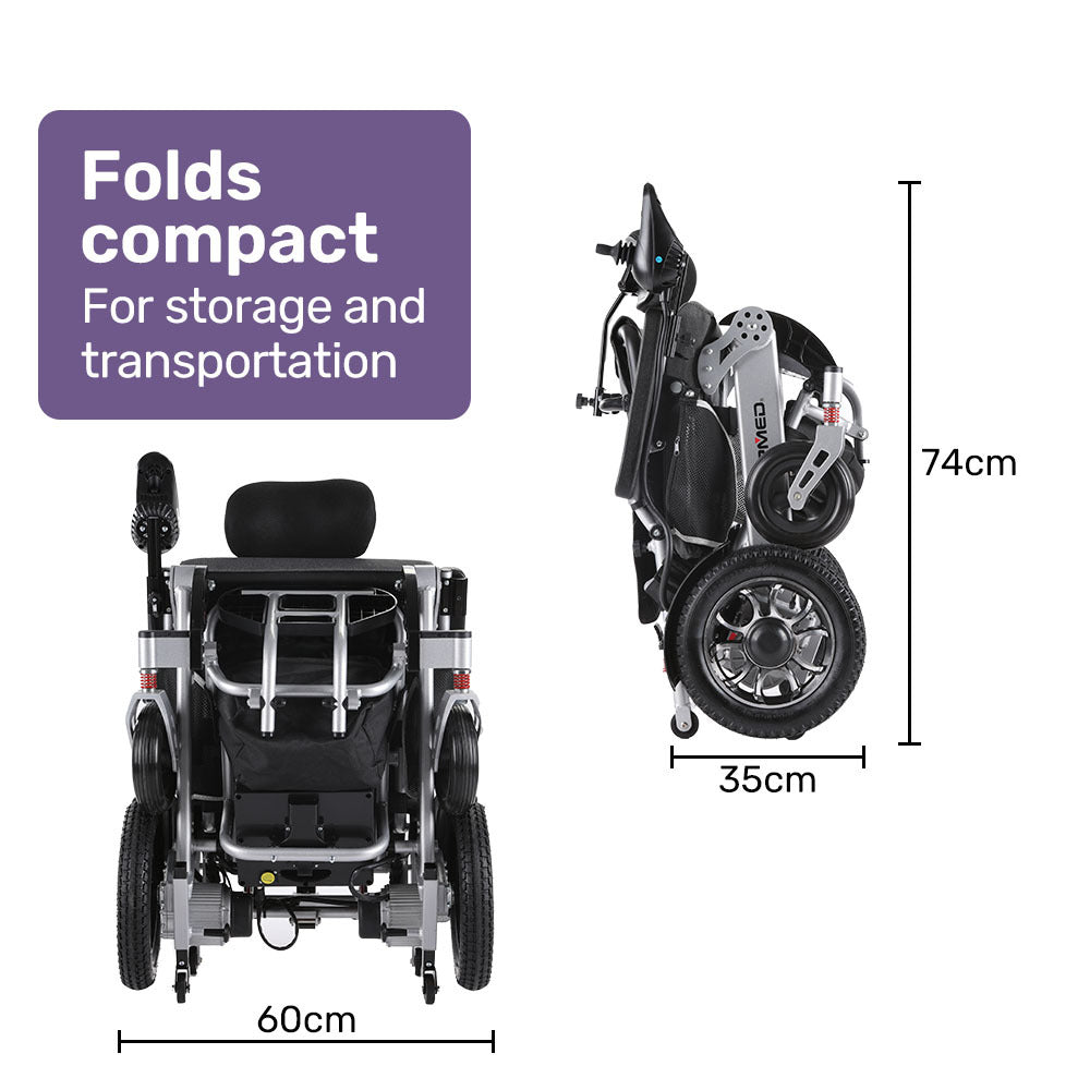 This lightweight aluminium Equipmed motorised power wheelchair is quick to fold for loading into a car boot or moving into a space-saving storage position.