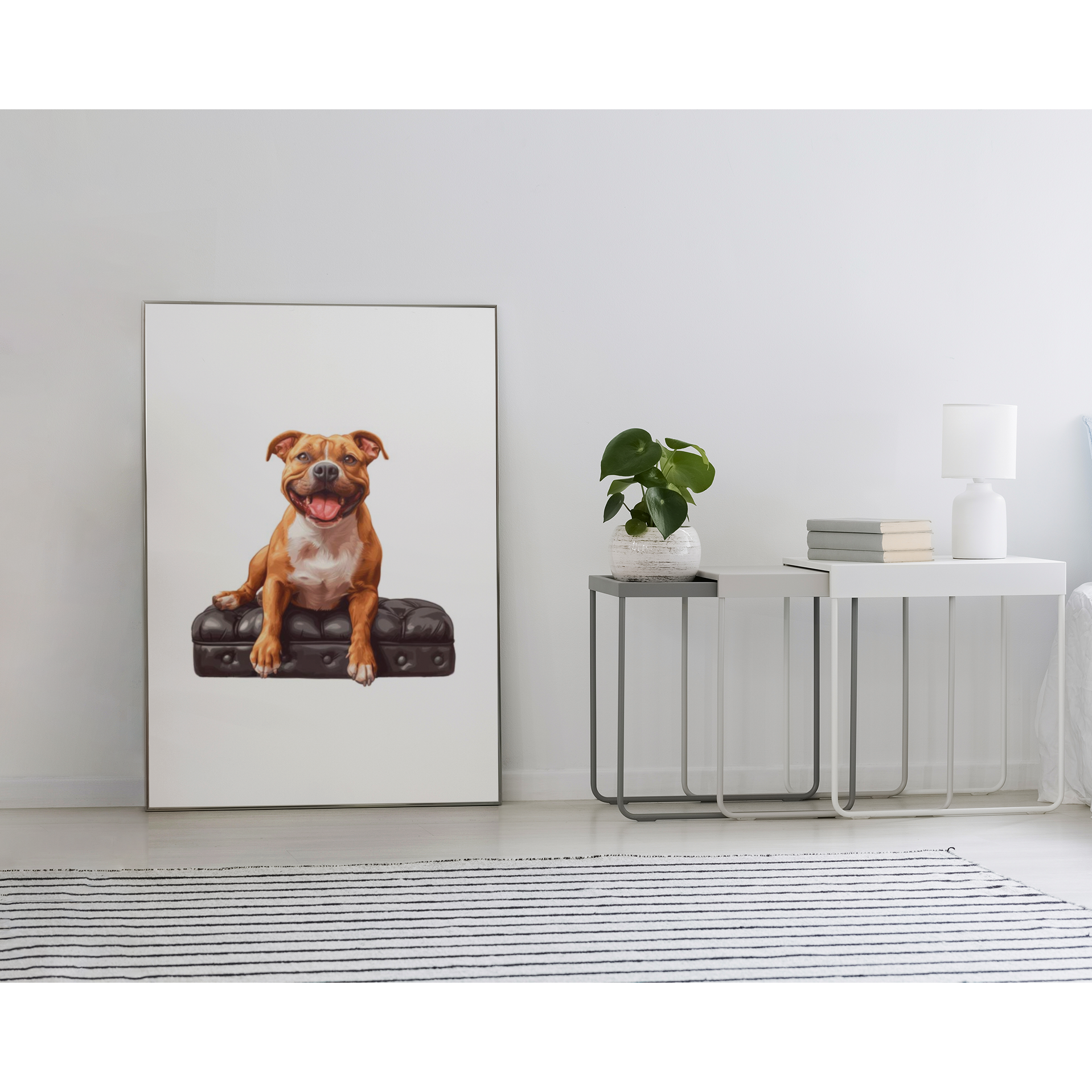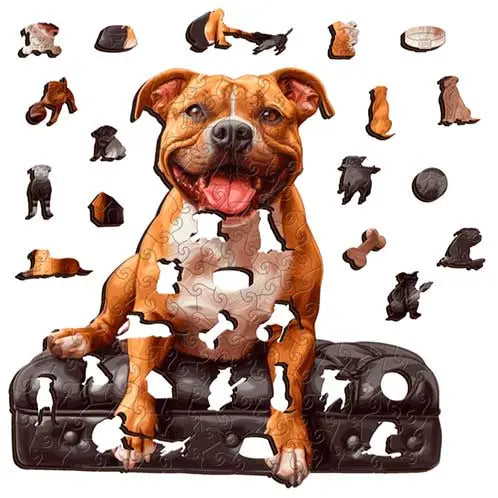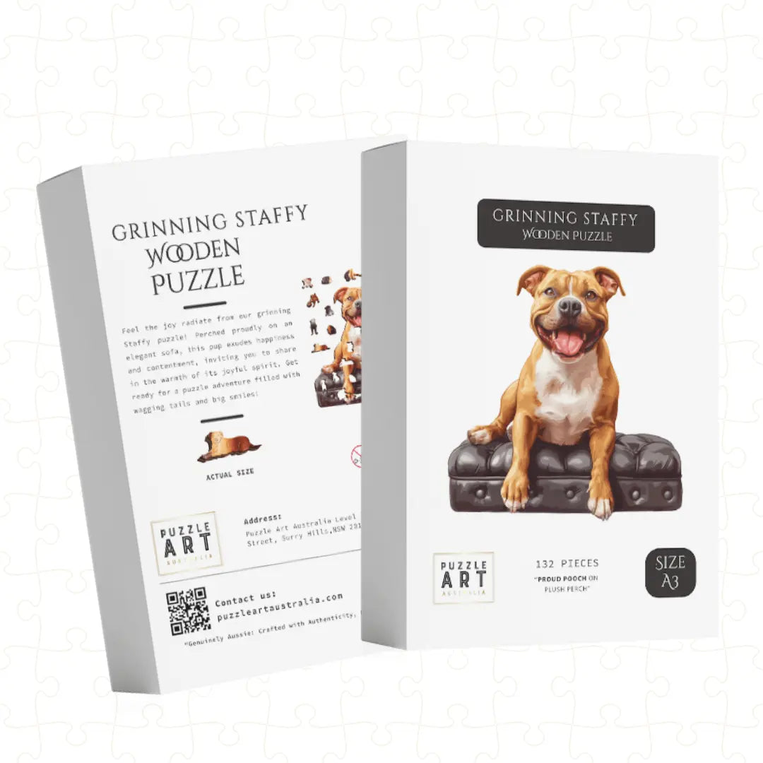 “Proud Pooch on Plush Perch" Feel the joy radiate from our grinning Staffy puzzle! 🐶😄 Perched proudly on an elegant... Read more