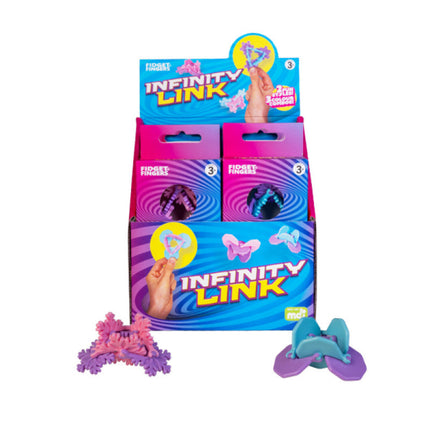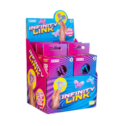 Unleash a world of vibrant, hands-on fun with Infinity Link—the ultimate fidget toy designed to keep your fingers busy and your mind focused. Choose from three eye-catching color combos—bold pinks, playful purples, and electric blues—that make every twist and turn a visual treat. With two unique twisty styles, each Infinity Link features tactile shapes that loop, flip, and snap, creating endless patterns and movements.