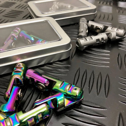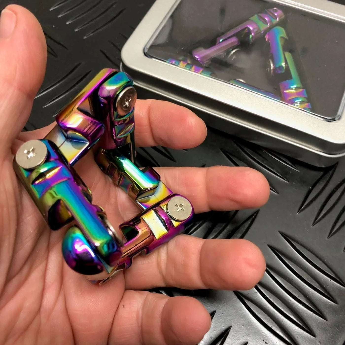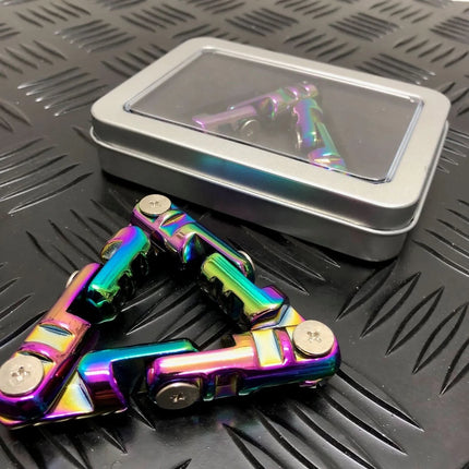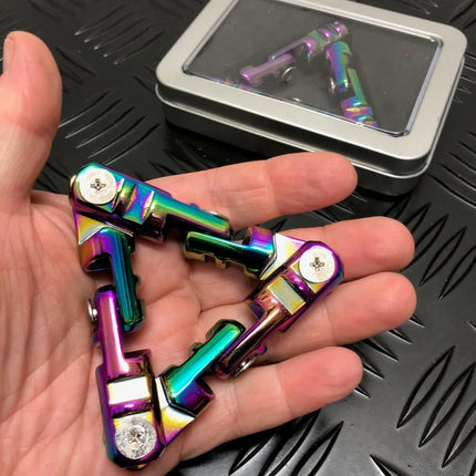 The Gunmetal Infinity Triangle is the lighter of the two, weighing approximately. 80 grams (Aluminium) & the Oli Slick Infinity Triangle, the heavier (Zinc Alloy) - weighing approx. 170 grams. Please note these both provide resistance on flipping, with the gun metal version being the most fluid.