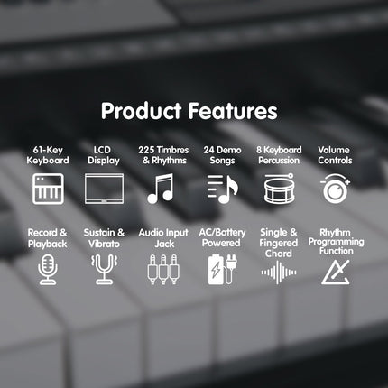 Loaded with 255 Timbres, 255 rhythms, 8 keyboard percussions, and 24 demonstration songs, this keyboard offers a full range of sounds to develop and hone your practice both quickly and easily.