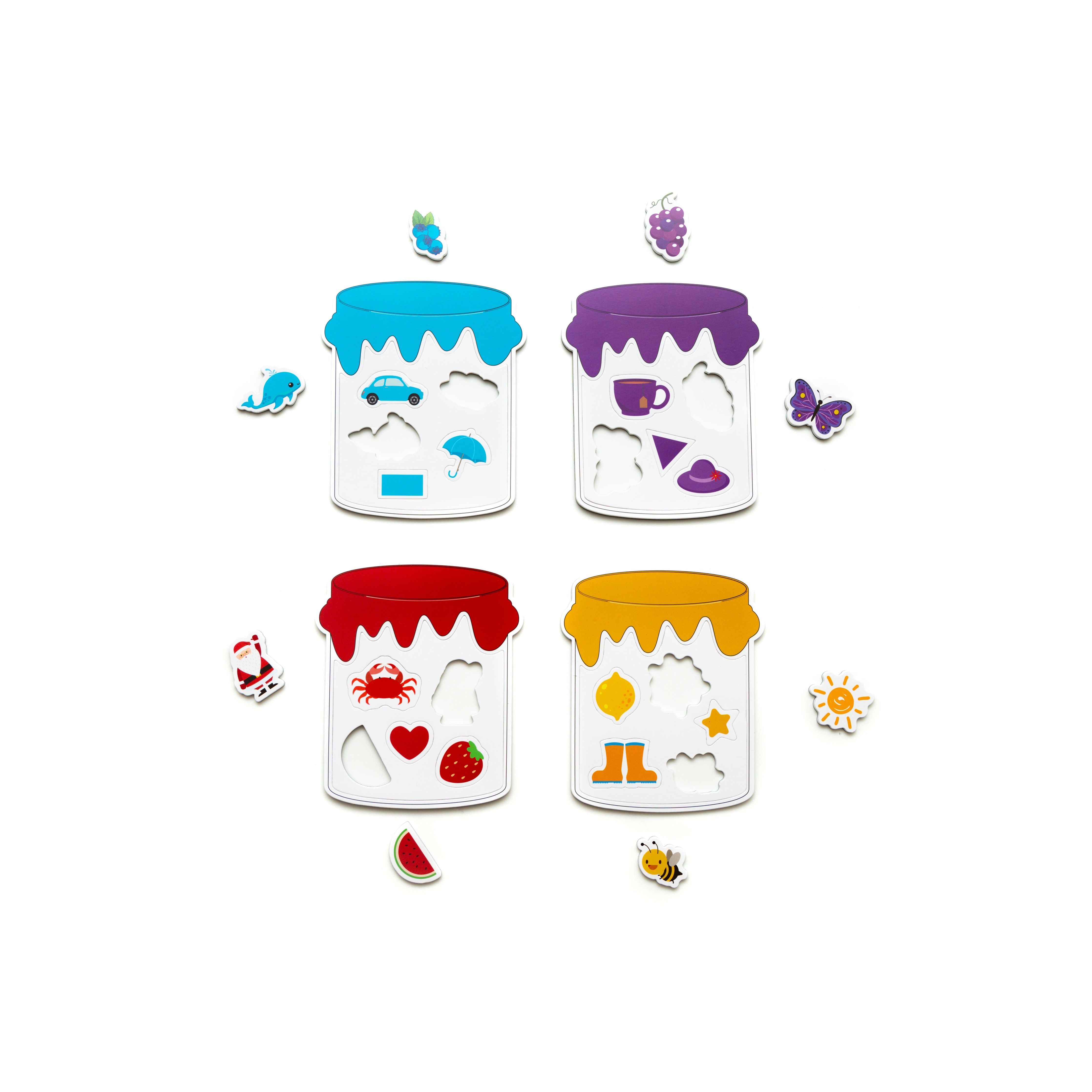 The set includes 11 different color candy jar frames and 121 color recognition magnets featuring various objects such as letters, toys, food, stationery, and animals.