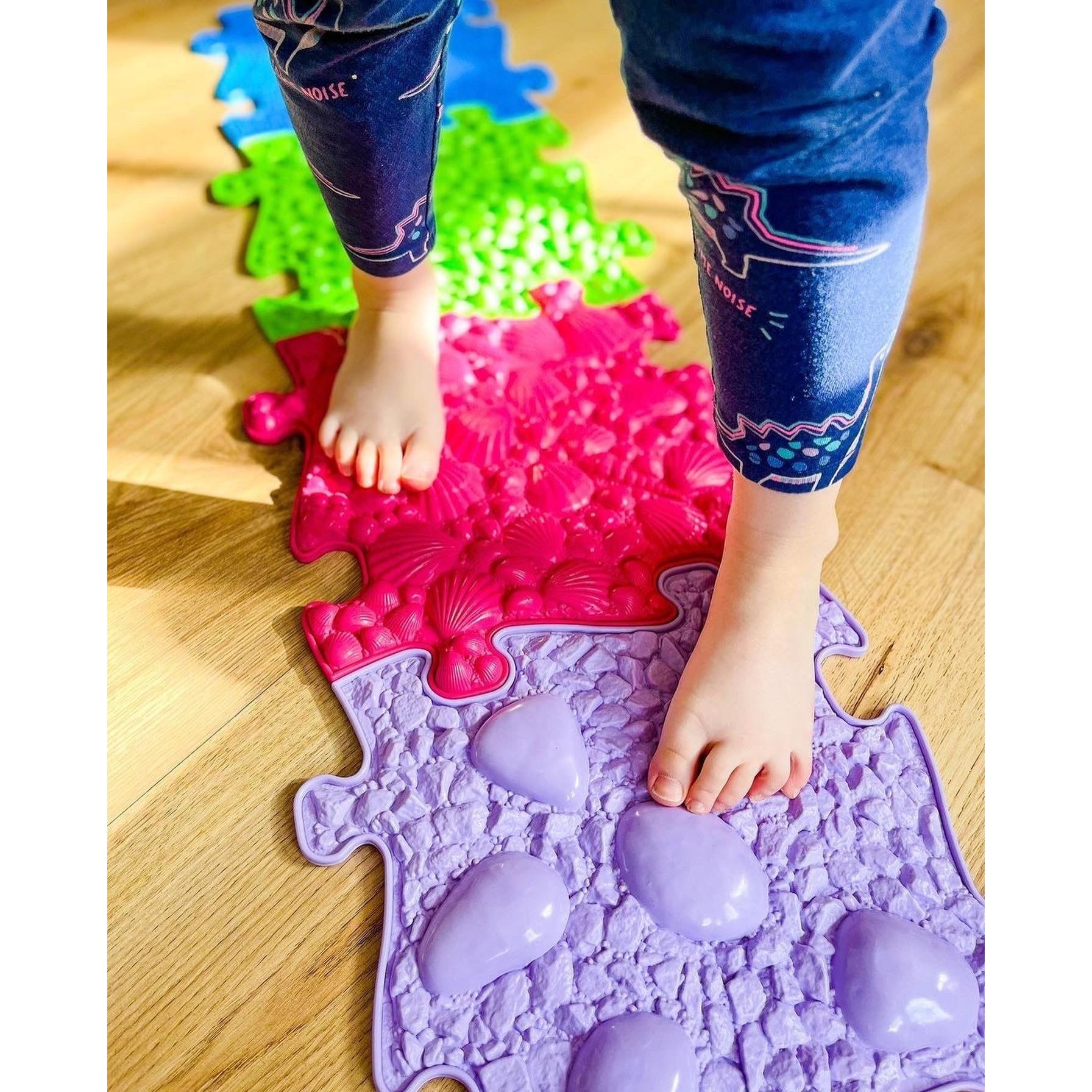 Combining SOFT and FIRM activity mats, this set will gently massage their feet on pink seashells, stimulate the foot with a touch of soft grass, promote blood circulation by walking on hard grass, exercise the foot and ankle with Dino eggs and strengthen their core with Twister which feels like waves!
