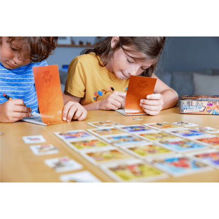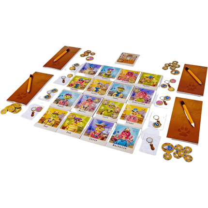 Thief! Sound the alarm and close the doors, quick! One of the museum artifacts has been stolen! The director is relying on you to unmask the thief (or thieves!) hidden among the 16 suspects still in the building. Each turn select a clue, put a price on it, keep track of your investigation in your notebook and suggest a suspect. Use your bluffing skills to throw off your opponents!