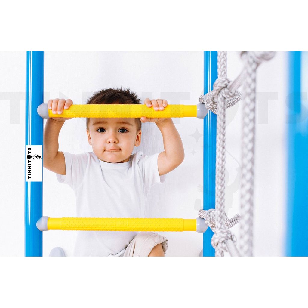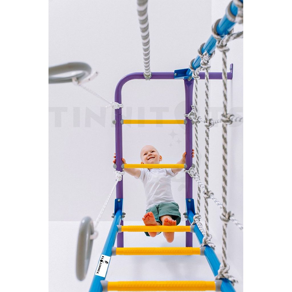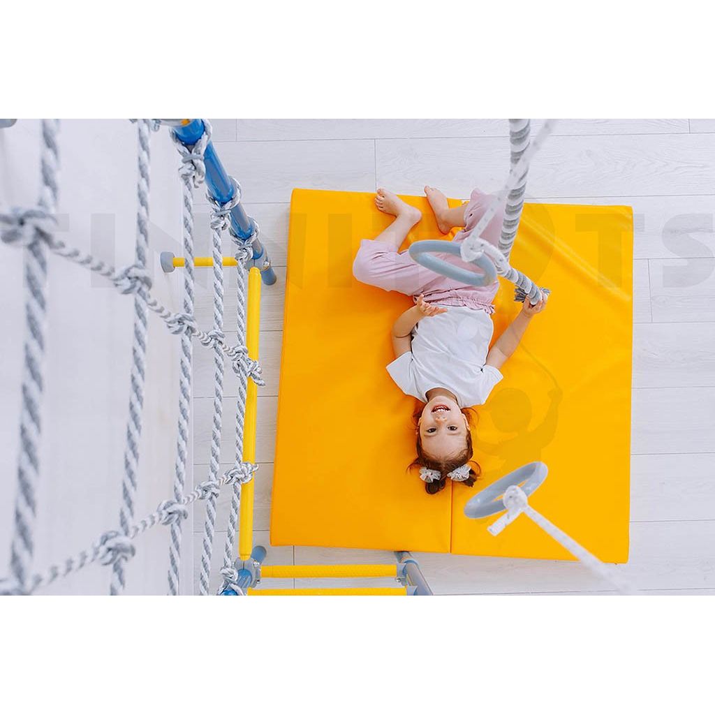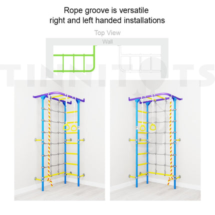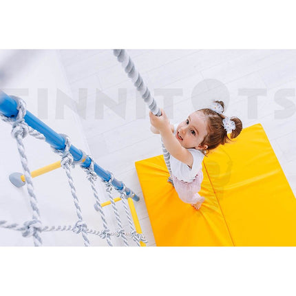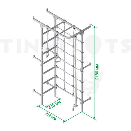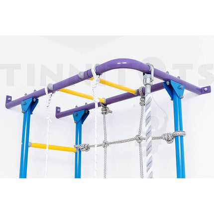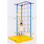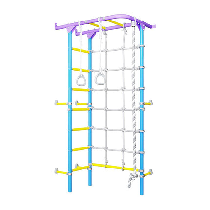 The Swedish Corner Wallbars - S4 is a climbing frame designed specifically for corner walls, ideal for homes or centers where space is a constraint. This playset comes with monkey bars, massage-effect ladders, a rope climber, gymnastics rings, and a spider net. The overall structure can withstand a weight of up to 100 kg (test load - 200 kg).