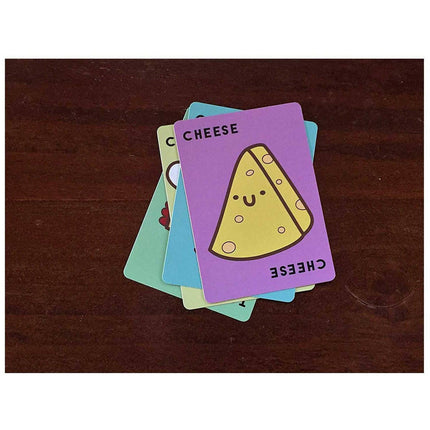 Each player places a card from their hand (like snap and dobble) face up in a community pile while saying taco/cat/goat/cheese/pizza in player sequence - when the card matches the mantra - boom - everyone slaps their hand on the deck - the last one picks up the cards - the winner is the player to lose all their cards first.