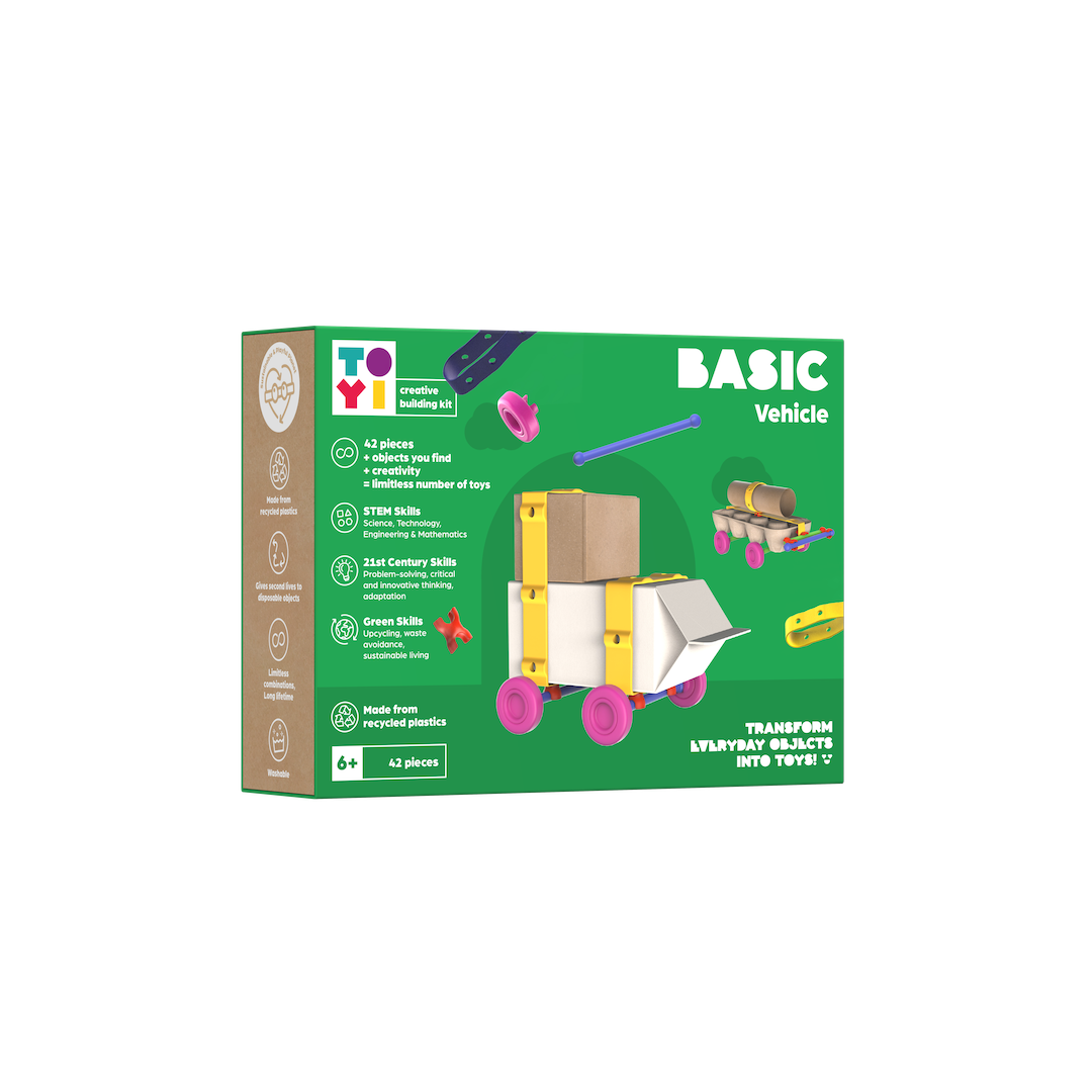 Toyi's Vehicle Building Kit is a 42 piece super fun building set for kids who loves cars and construction vehicles! Transform a empty milk box into a train or a shampoo box into a scooter and create your own trains, scooters and cars.